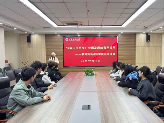 在中华人民共和国成立76周年之际,为引导青年学子读懂国家发展的时代脉络,厚植家国情怀,物理与新能源学院团委于9月30日在学院会议室308举办《76年山河巨变:中国发展的青年观察视角》主题讲座。学院各院系青年学生代表、团学骨干到场参与。
