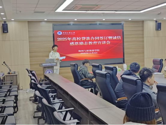 为精准落实2025年国家及高校资助政策,助力家庭经济困难学子顺利完成学业,强化学生诚信意识与感恩情怀,物理与新能源学院于11月5日在实训楼34307会议室召开2025年高校贷款合同签订暨诚信感恩励志教育宣讲会。会议由学院辅导员周士越主持,学院资助助理成员及全体申请高校贷款的学生参与。
