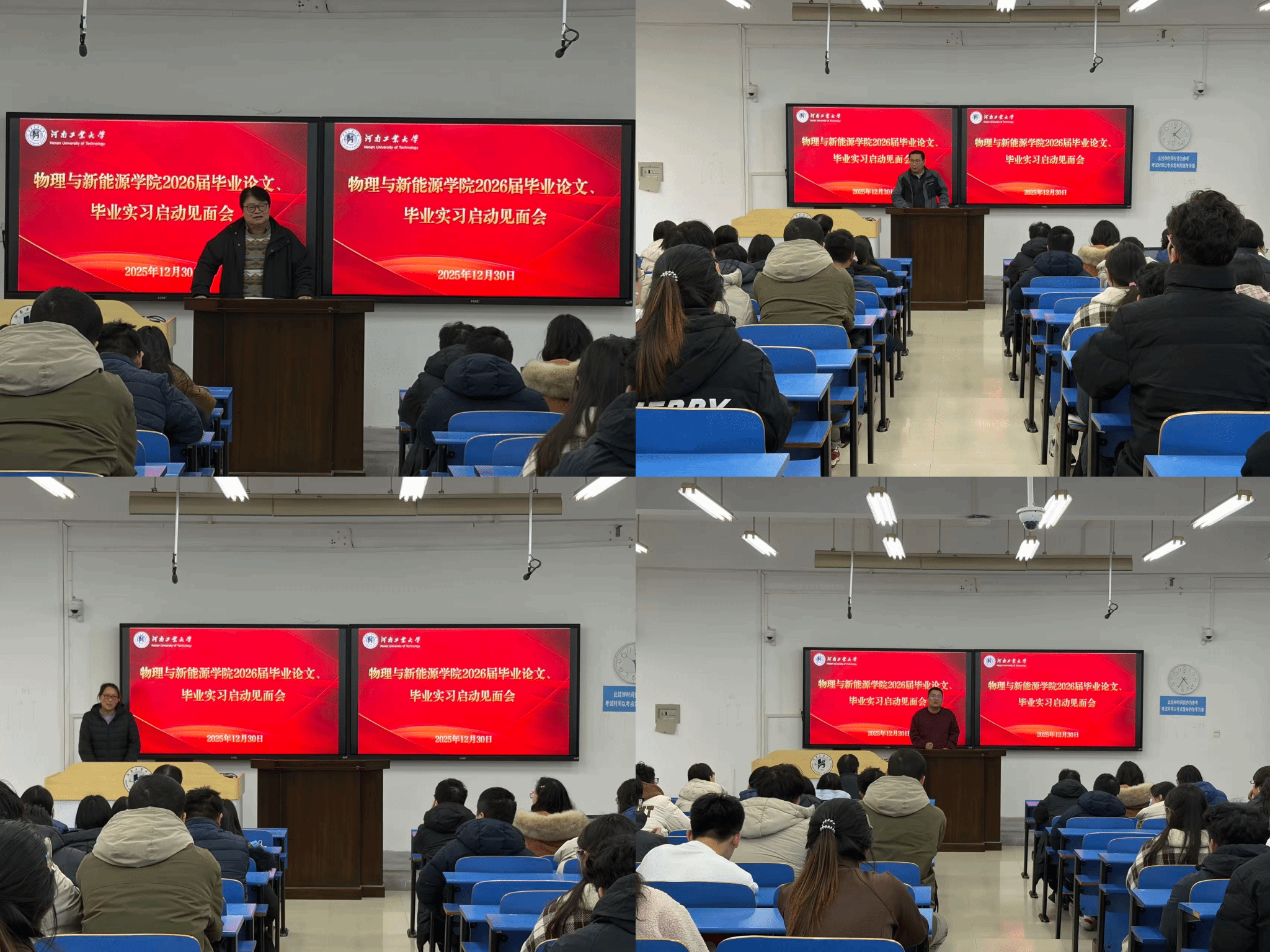 为扎实推进本科毕业论文与毕业实习工作,引导学生做好规划,物理与新能源学院于2025年12月30日下午,在4号教学楼206教室组织召开2026届毕业论文、毕业实习启动见面会。会议由副院长罗艳伟主持,学院院长赵新为、学工办与教学办工作人员、全体毕业论文指导教师以及2026届毕业生共同参加了本次会议。